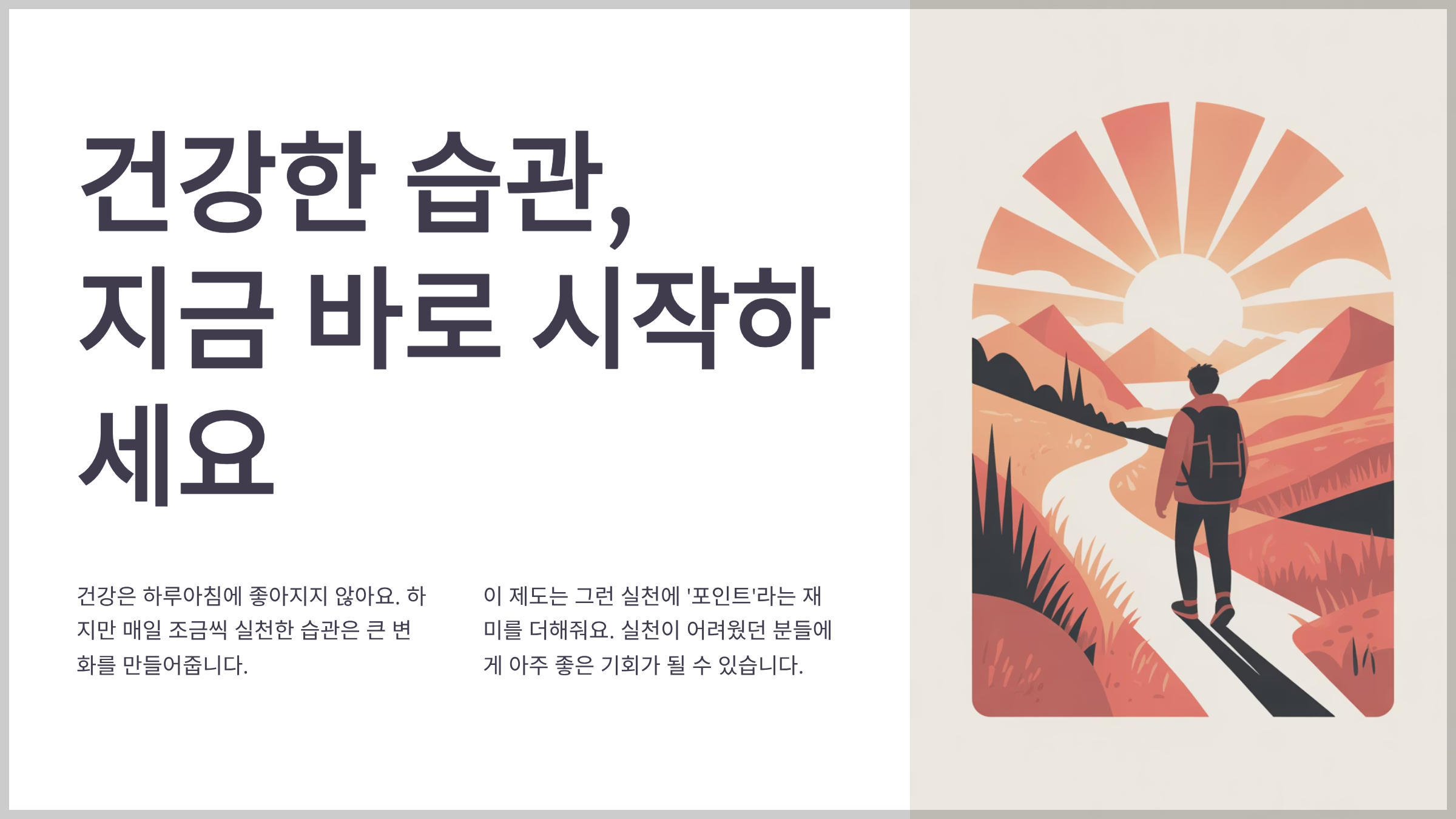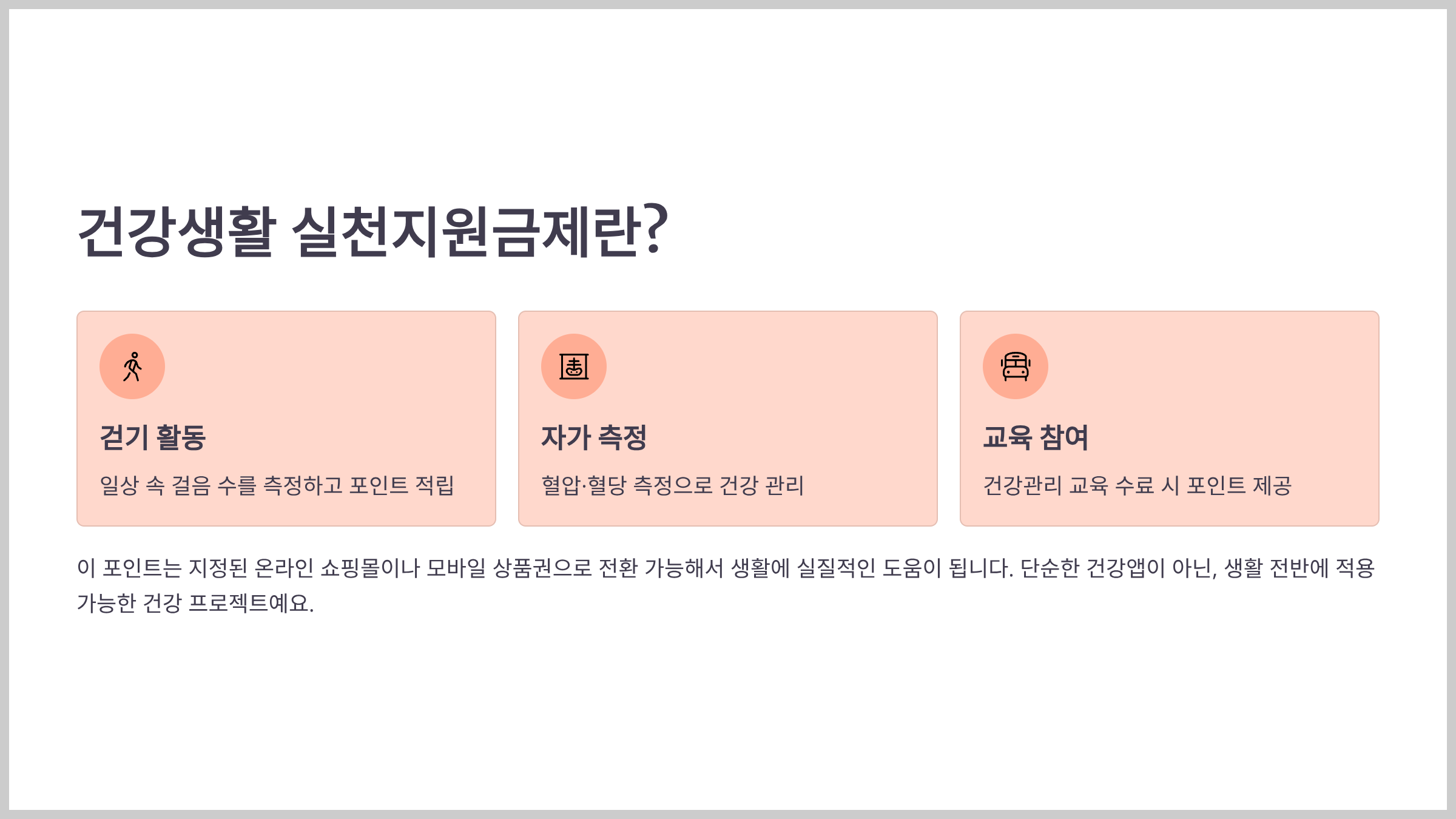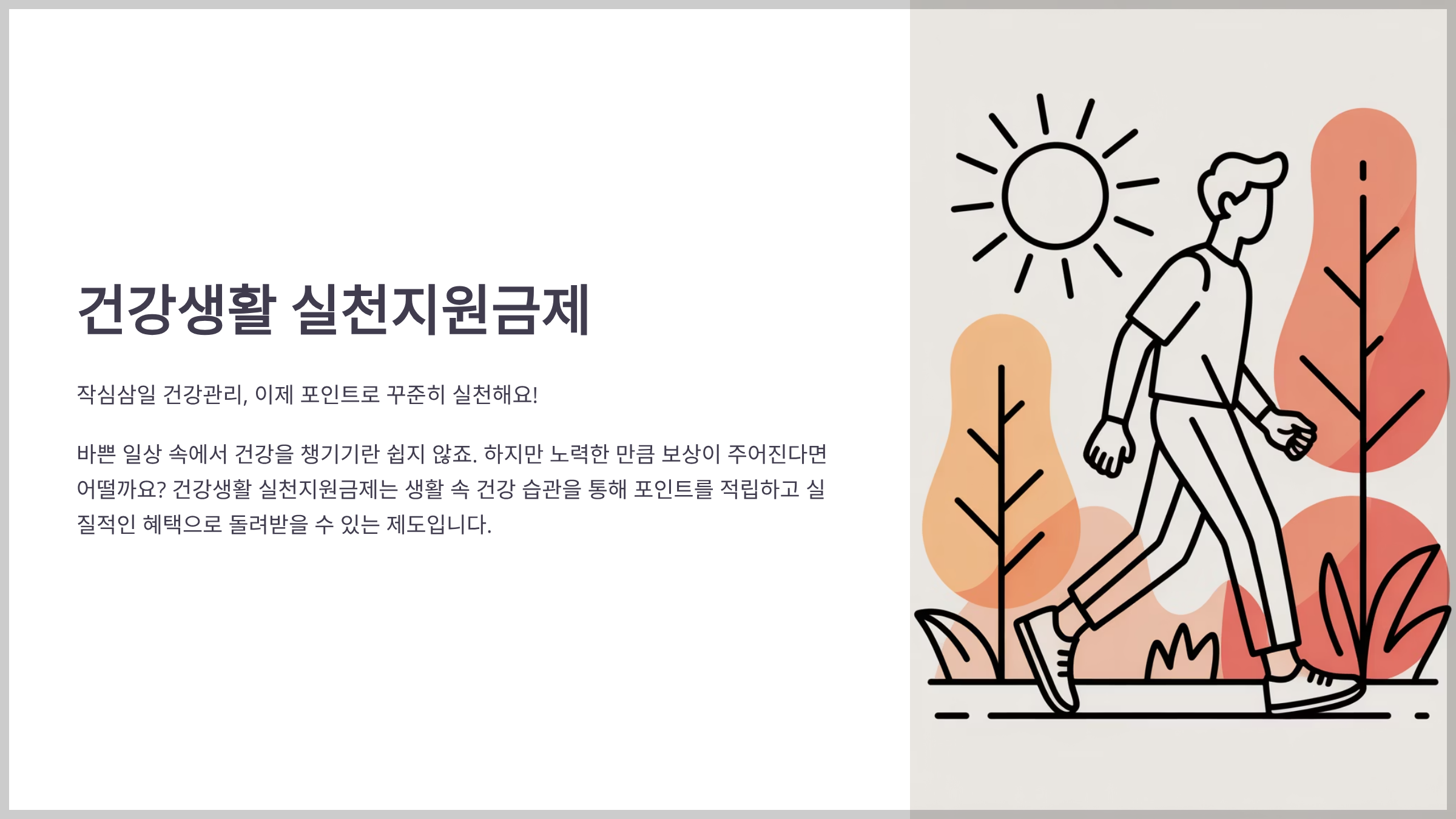 건강생활 실천지원금제는 생활 속 건강 습관을 통해 포인트를 적립하고 실질적인 혜택으로 돌려받을 수 있는 제도입니다.