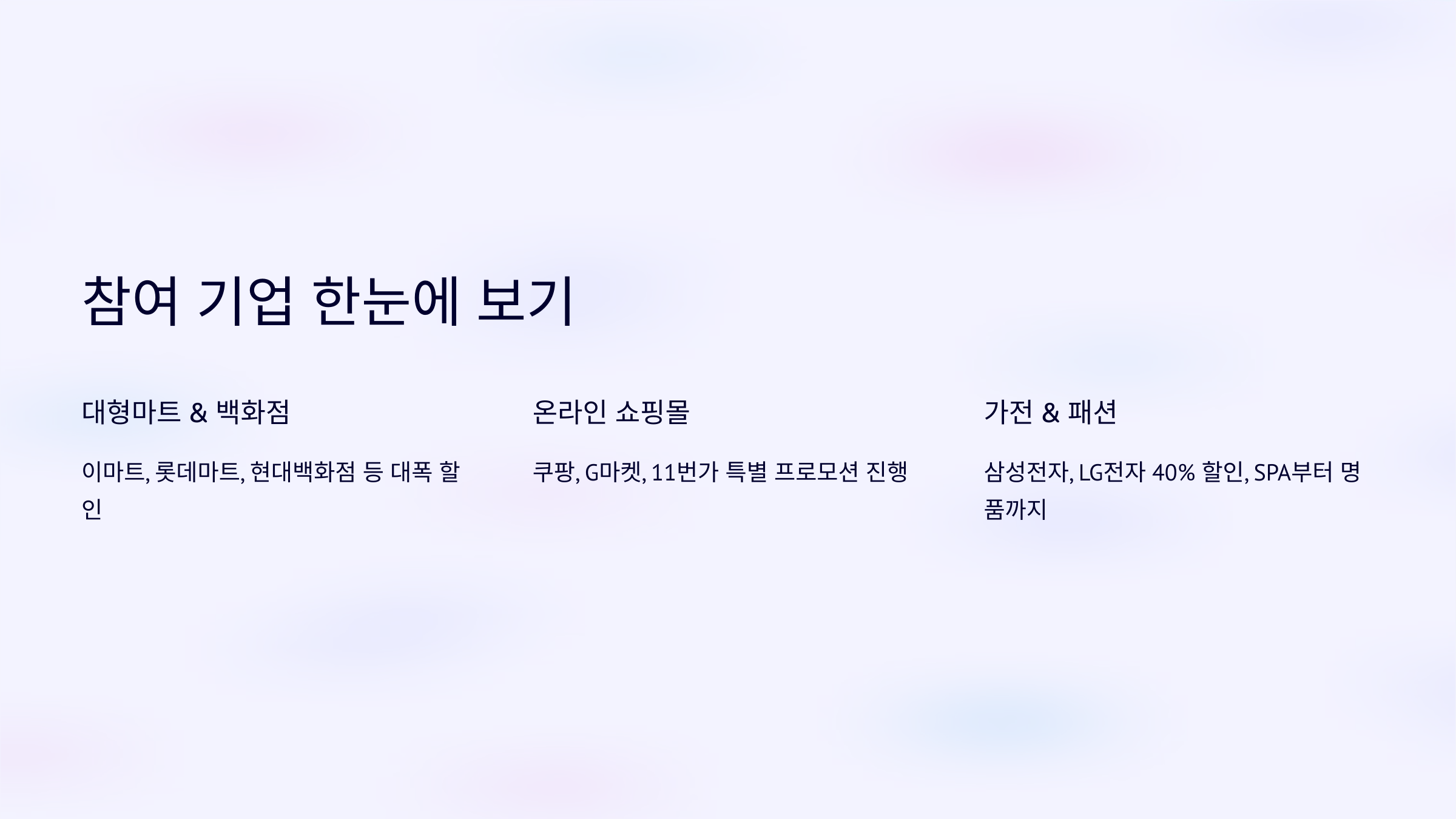 무려 2,600개 이상의 기업이 참여하고, 자동차, 가전제품, 패션, 심지어 숙박과 놀이공원 할인까지?! 😱