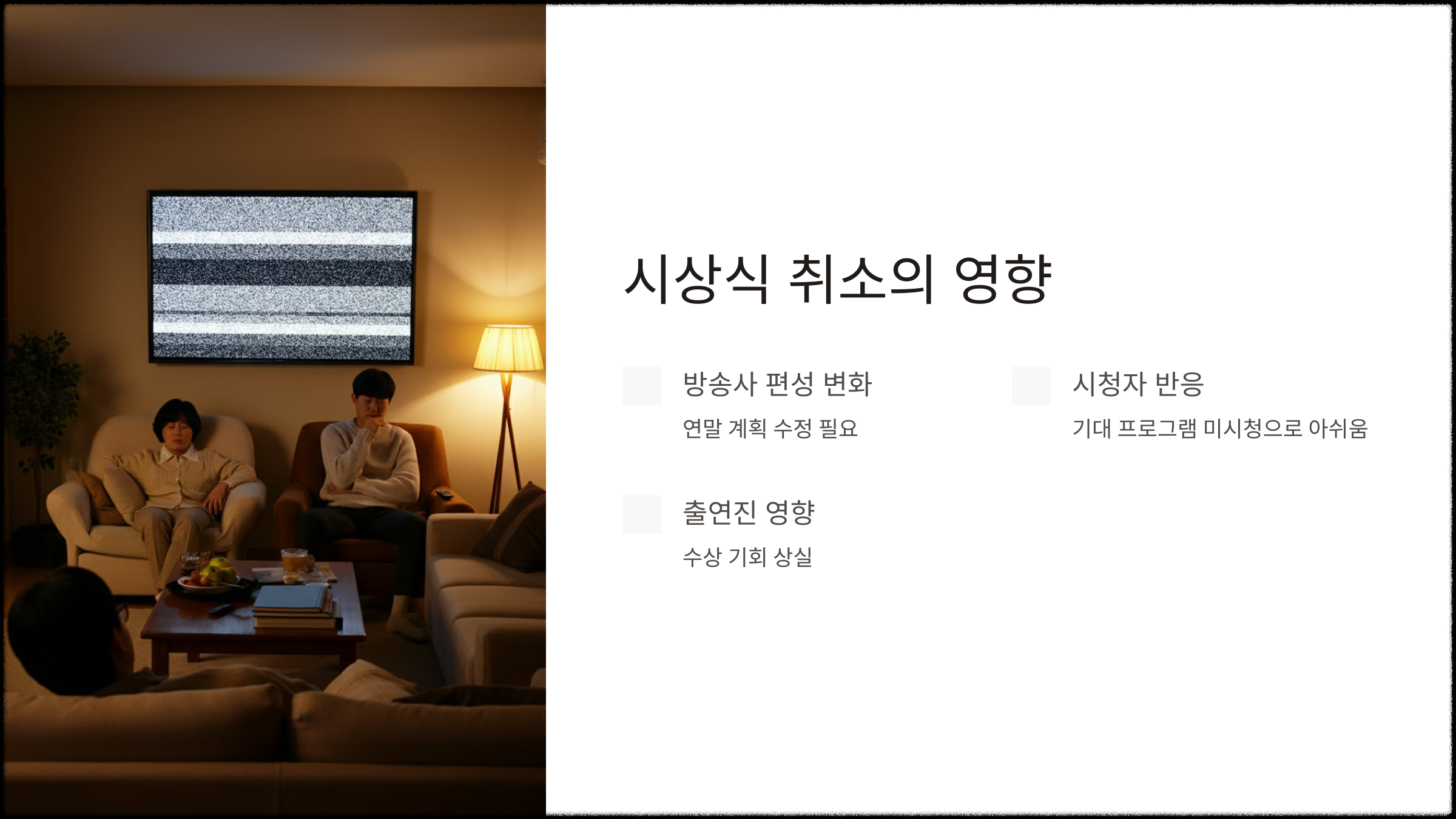 시청자들은 기대하던 프로그램을 시청하지 못하게 되어 아쉬움을 느낄 수 있으며, 수상 예정이었던 작품과 출연진들에게도 영향이 있을 것으로 보입니다.