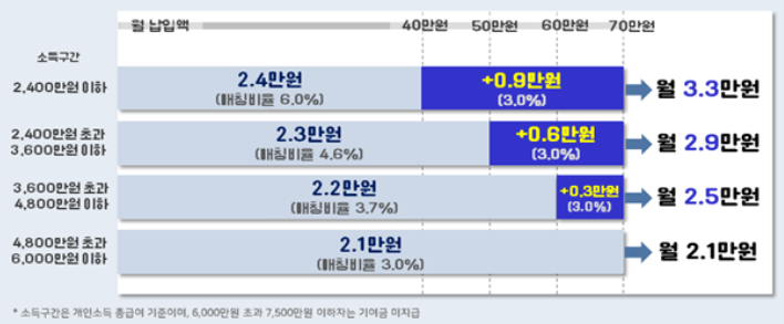 - 매칭 한도 상향: 모든 소득 구간에서 월 납입 한도가 70만 원까지 확대되며, 이에 따라 정부 기여금 지원도 늘어납니다.