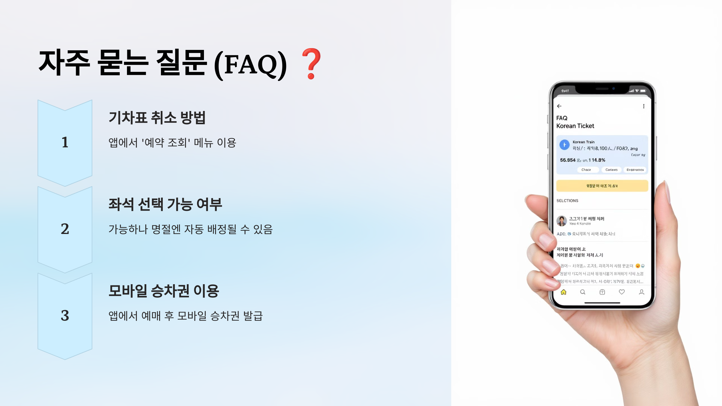 - A2. 예매 과정에서 좌석 선택이 가능하지만, 명절 기간에는 자동 배정될 수 있습니다.