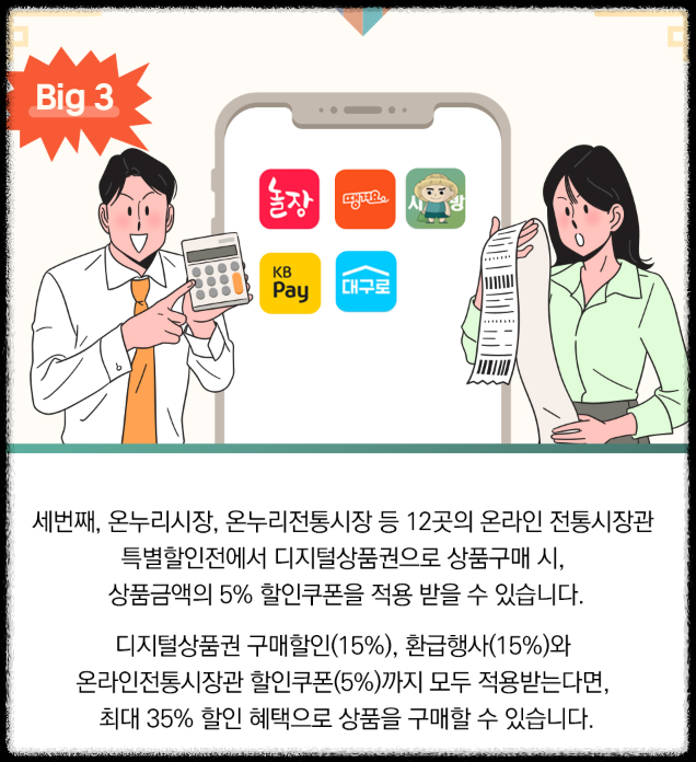 5% 추가 할인쿠폰: 온라인 전통시장관 특별할인전에서 디지털 상품권으로 구매 시 적용 가능