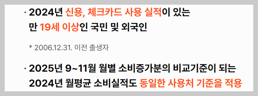 만 19세 이상, 즉 2006년 12월 31일 이전 출생자면 OK! 단, 2024년에 본인 명의의 카드 실적이 있어야 합니다.