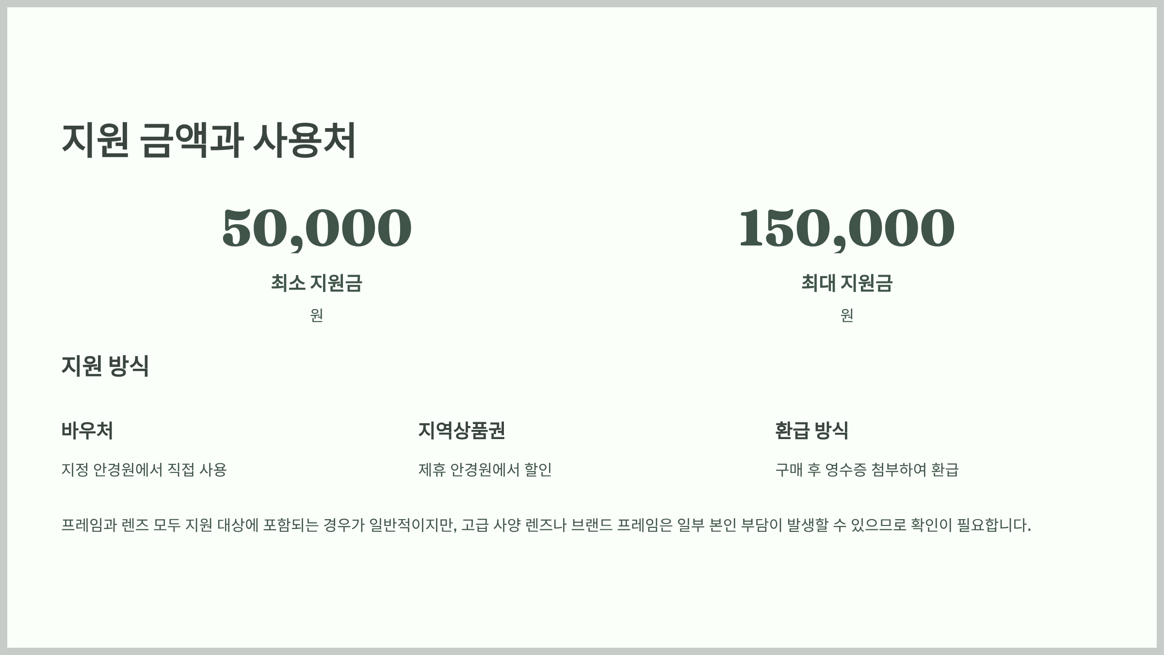 지원방식: 바우처, 지역상품권, 안경원 제휴 할인 등
