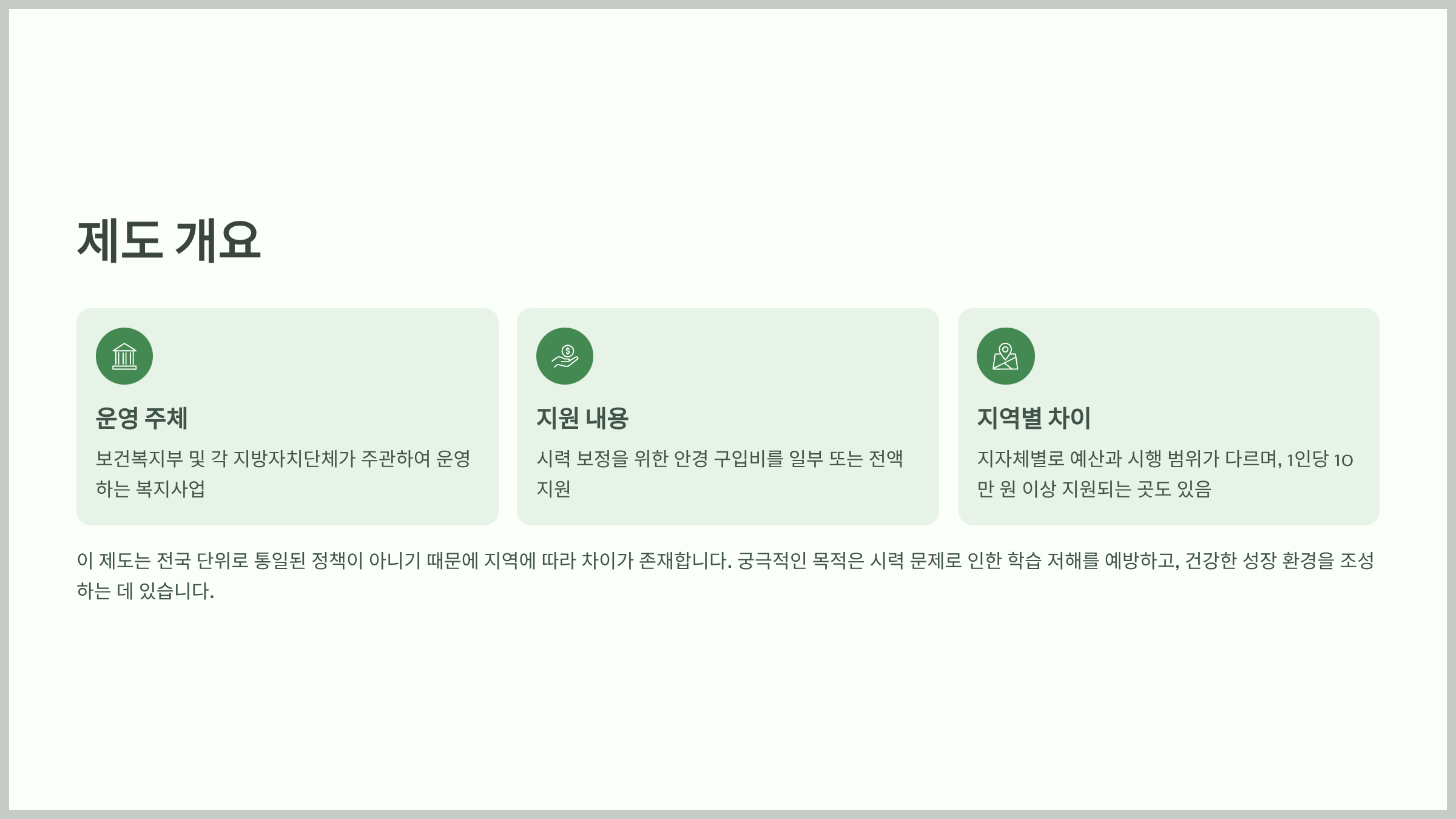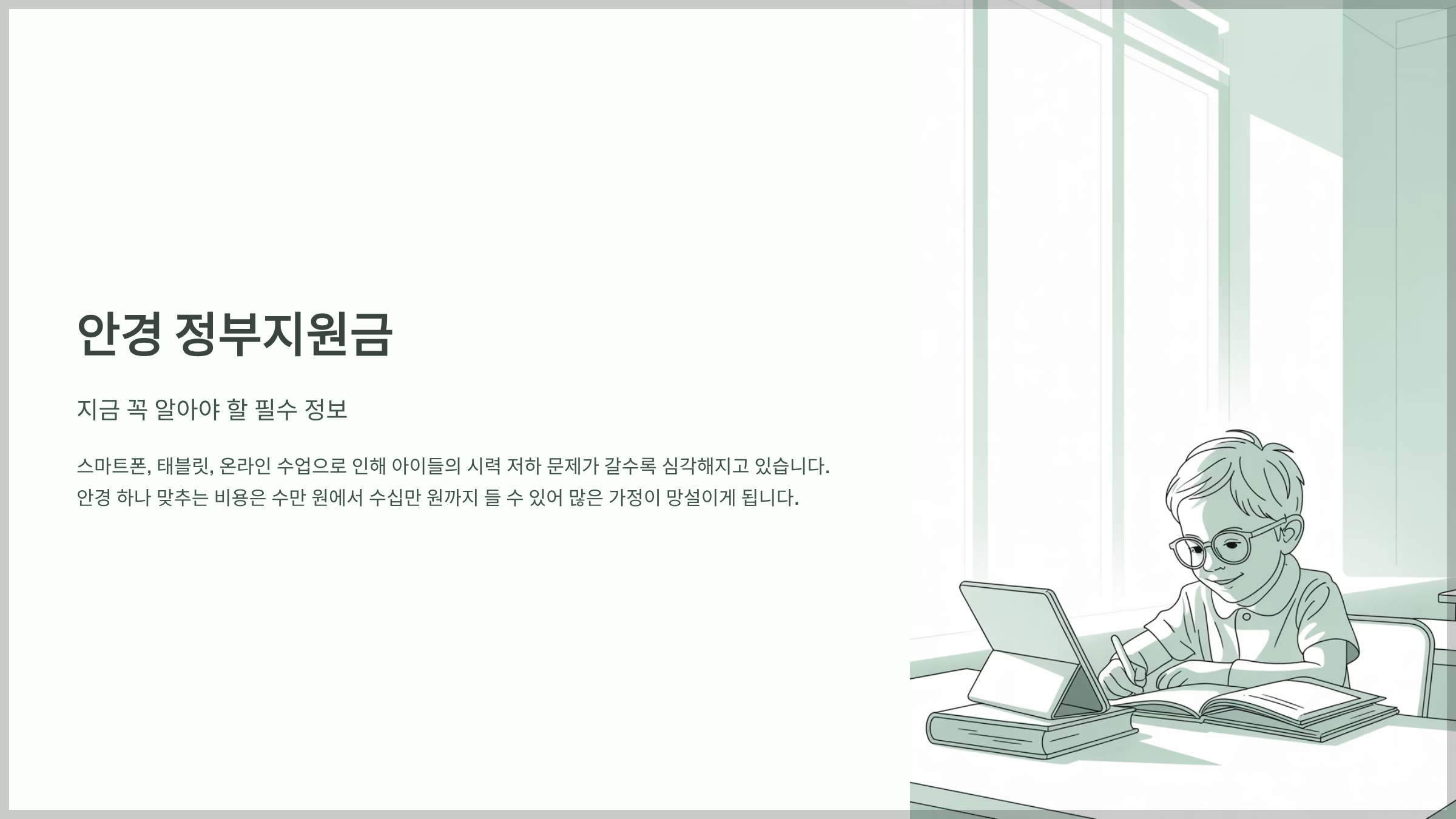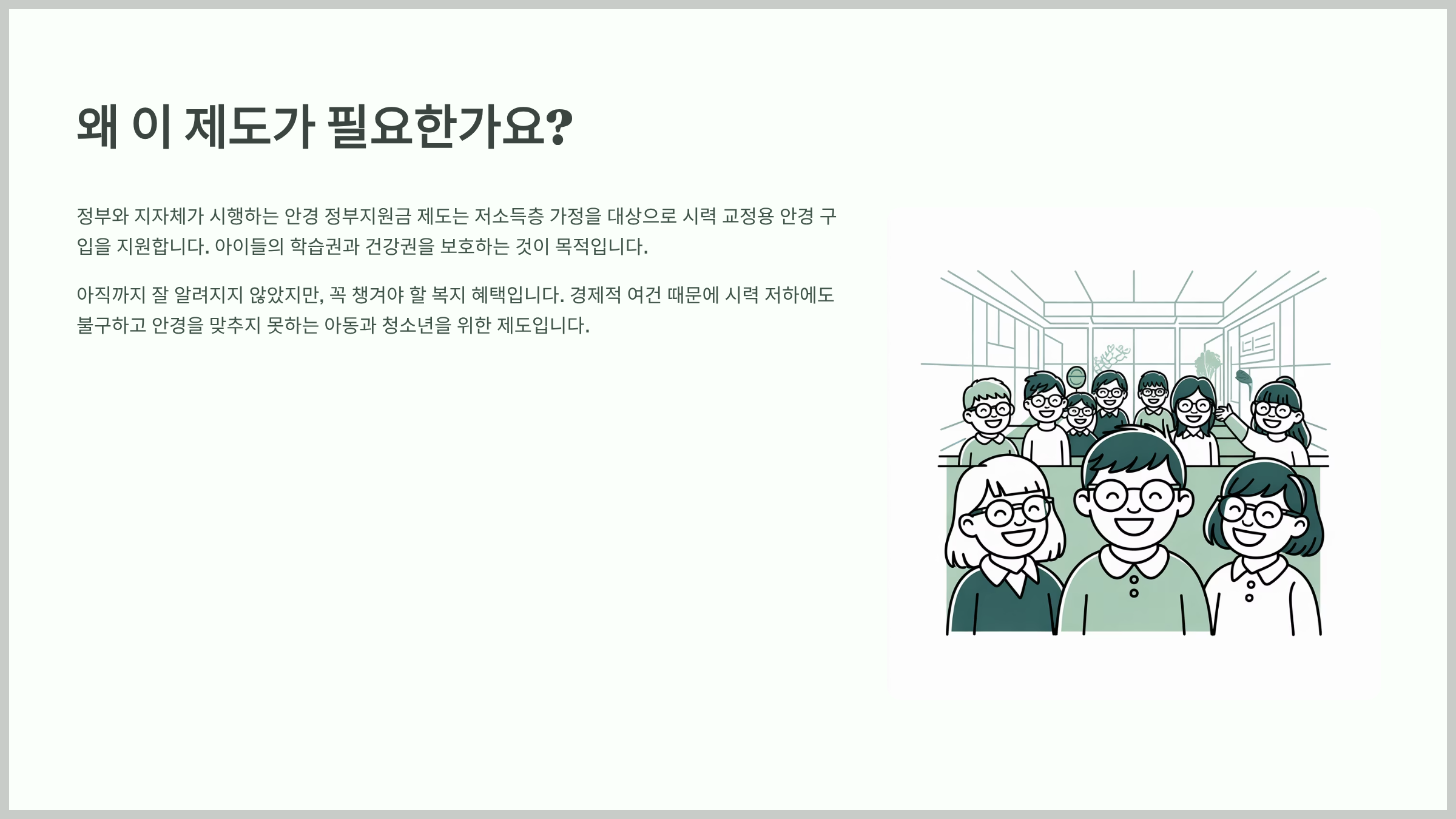 정부와 지자체가 시행하는 이 제도는 저소득층 가정을 대상으로 시력 교정용 안경 구입을 지원함으로써, 아이들의 학습권과 건강권을 보호하는 데 목적이 있습니다.