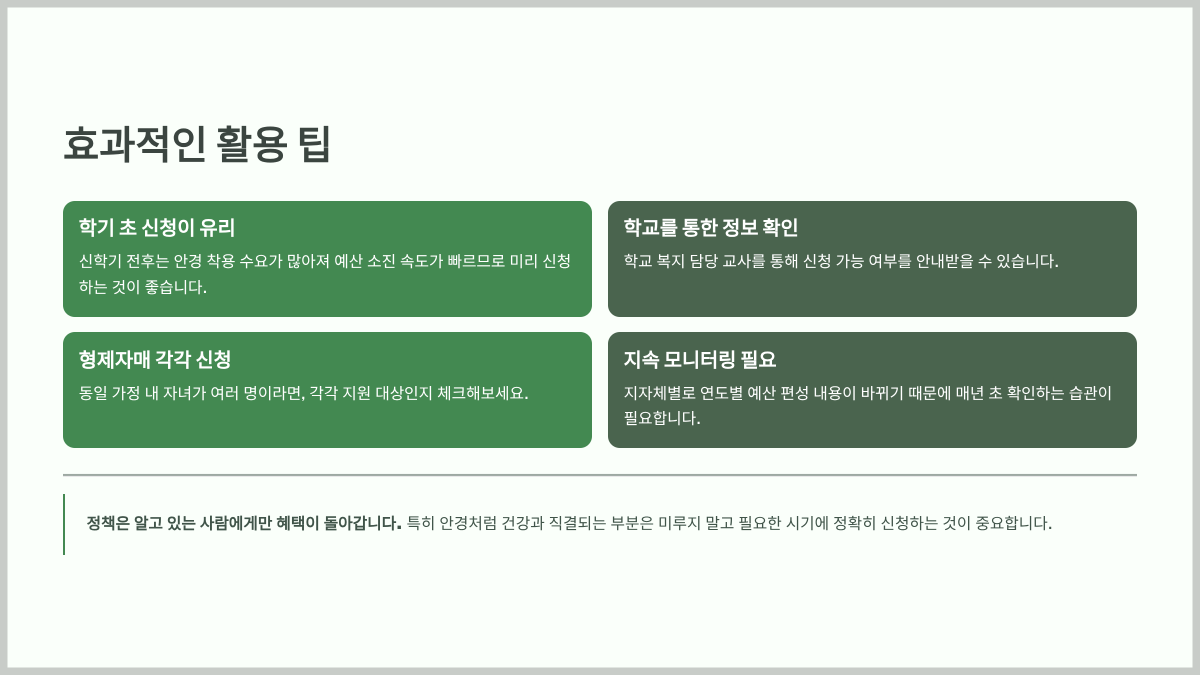 특히 안경처럼 건강과 직결되는 부분은 미루지 말고 필요한 시기에 정확히 신청하는 것이 중요합니다.