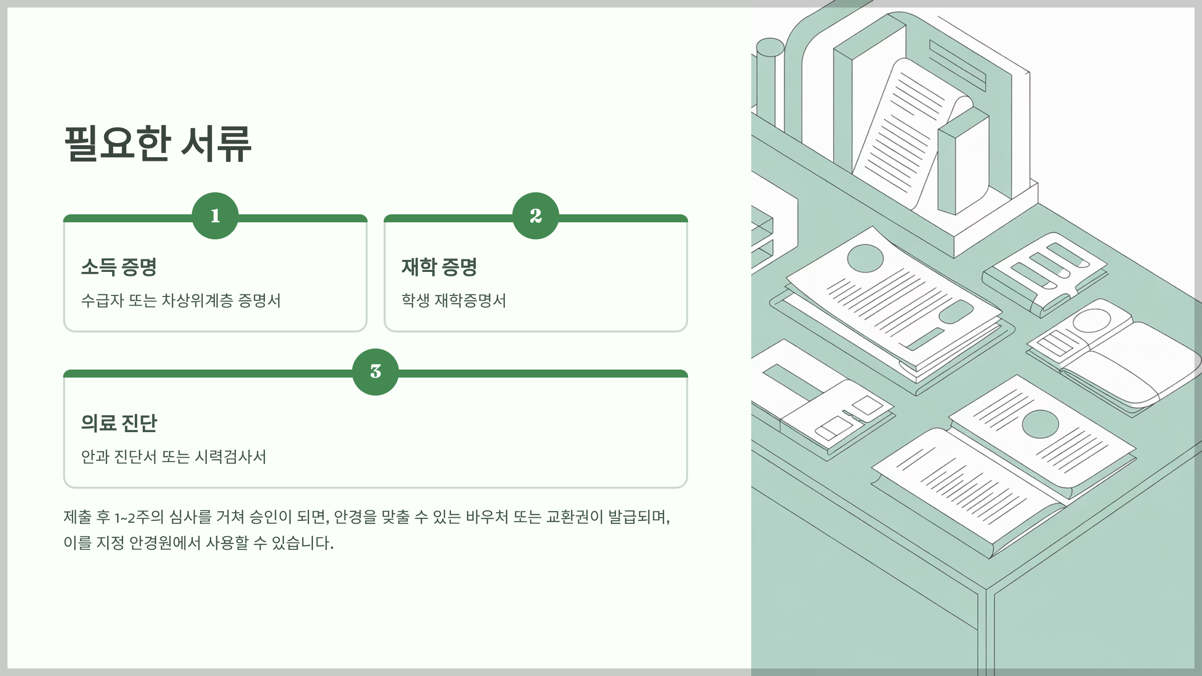 제출 후 1~2주의 심사를 거쳐 승인이 되면, 안경을 맞출 수 있는 바우처 또는 교환권이 발급되며, 이를 지정 안경원에서 사용할 수 있습니다.