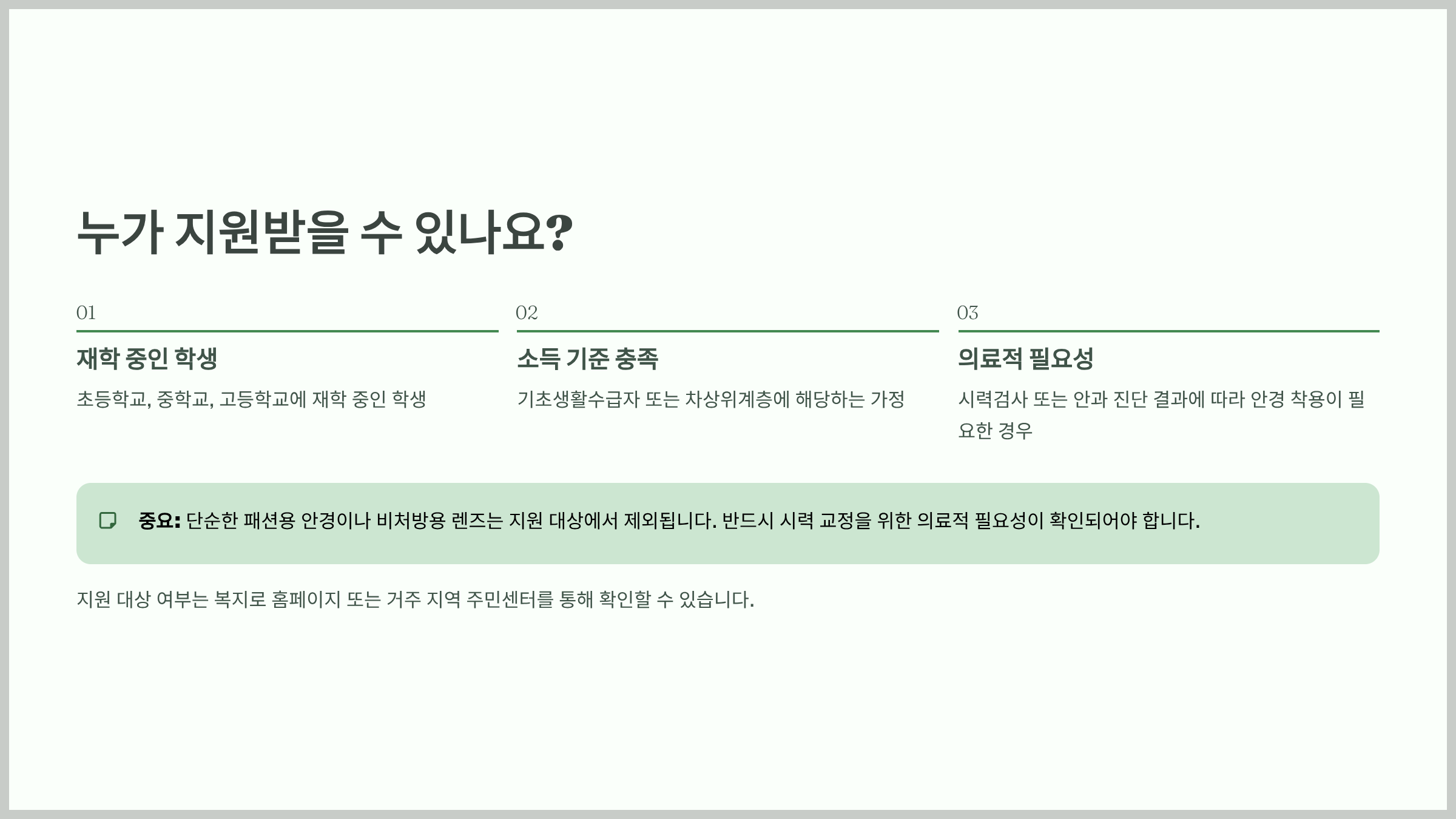 또한 프레임과 렌즈 모두 지원 대상에 포함되는 경우가 일반적이지만, 고급 사양 렌즈나 브랜드 프레임은 일부 본인 부담이 발생할 수 있으므로 확인이 필요합니다.