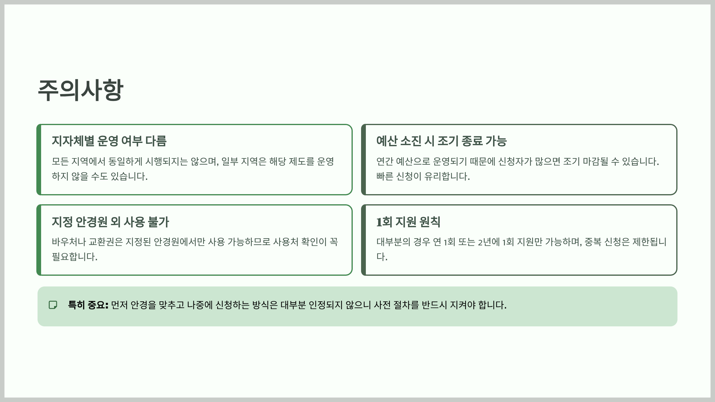 이러한 조건들을 꼼꼼히 확인하지 않으면, 신청하고도 지원을 못 받는 경우가 생길 수 있습니다.
