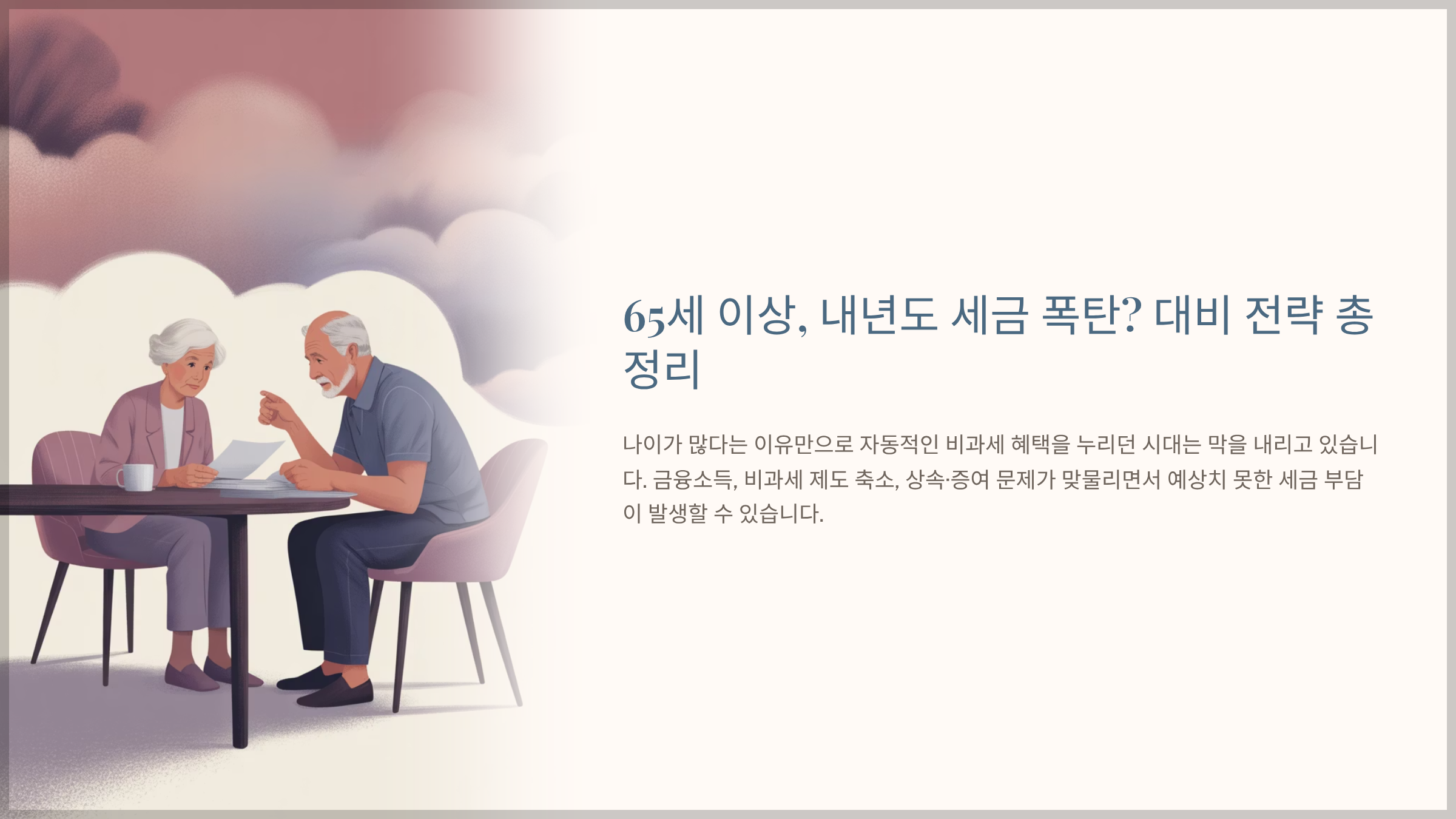 오늘 정리한 내용을 바탕으로 65세 이상 독자분들은 내년의 세금 변화에 적극적으로 대비하시길 권장합니다.