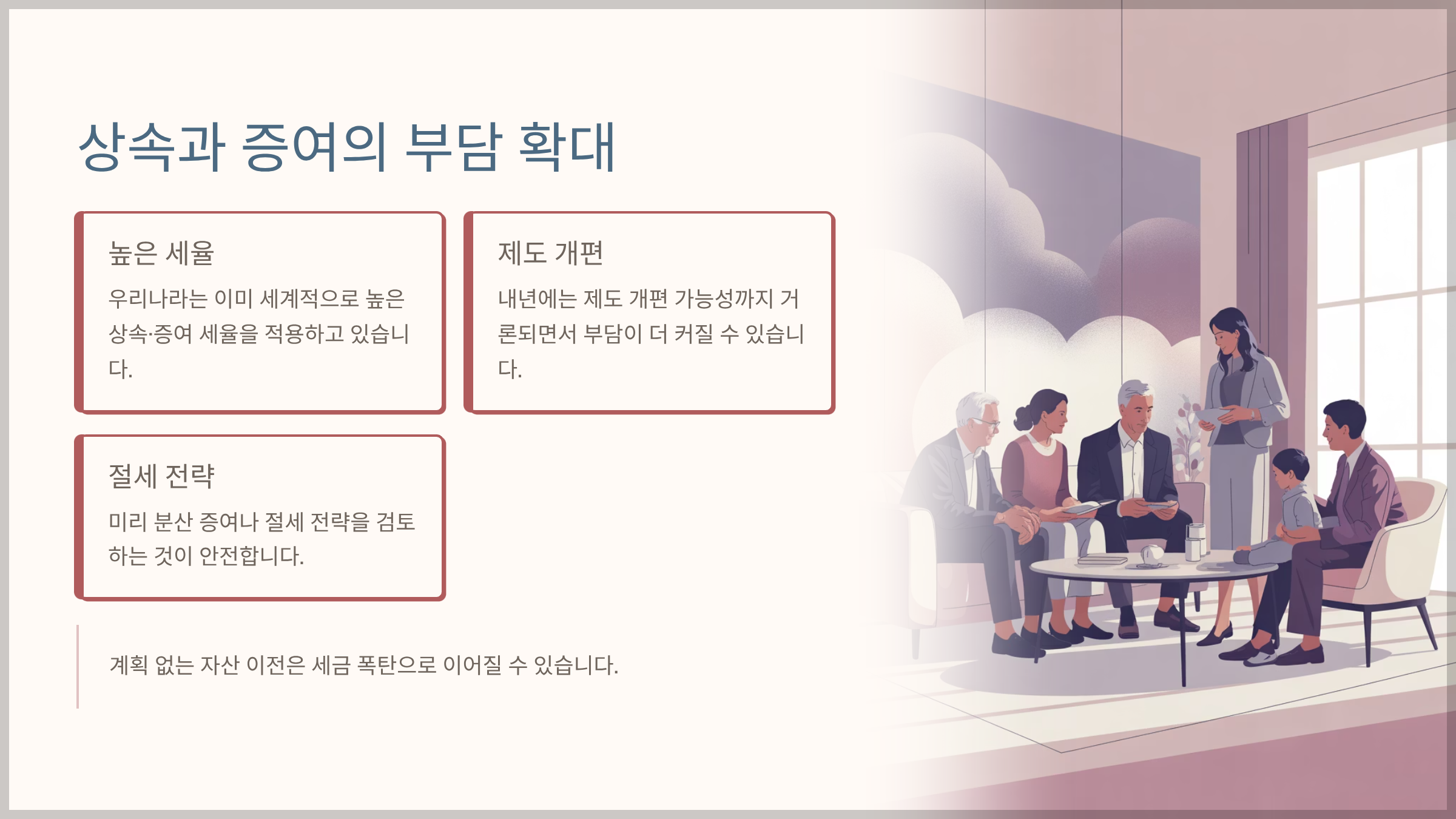 상속과 증여 과정에서 부과되는 세금은 고령층이 자산을 이전할 때 가장 큰 부담으로 작용합니다.