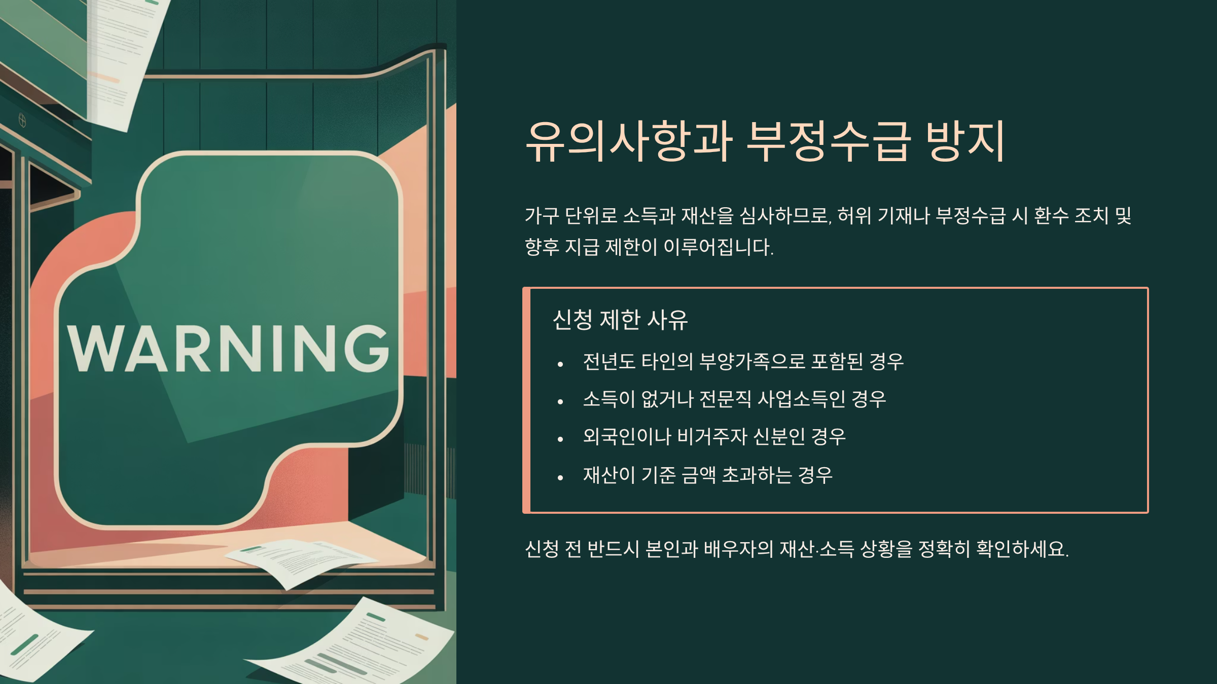 신청 전 반드시 본인과 배우자의 재산·소득 상황을 정확히 확인해야 합니다.