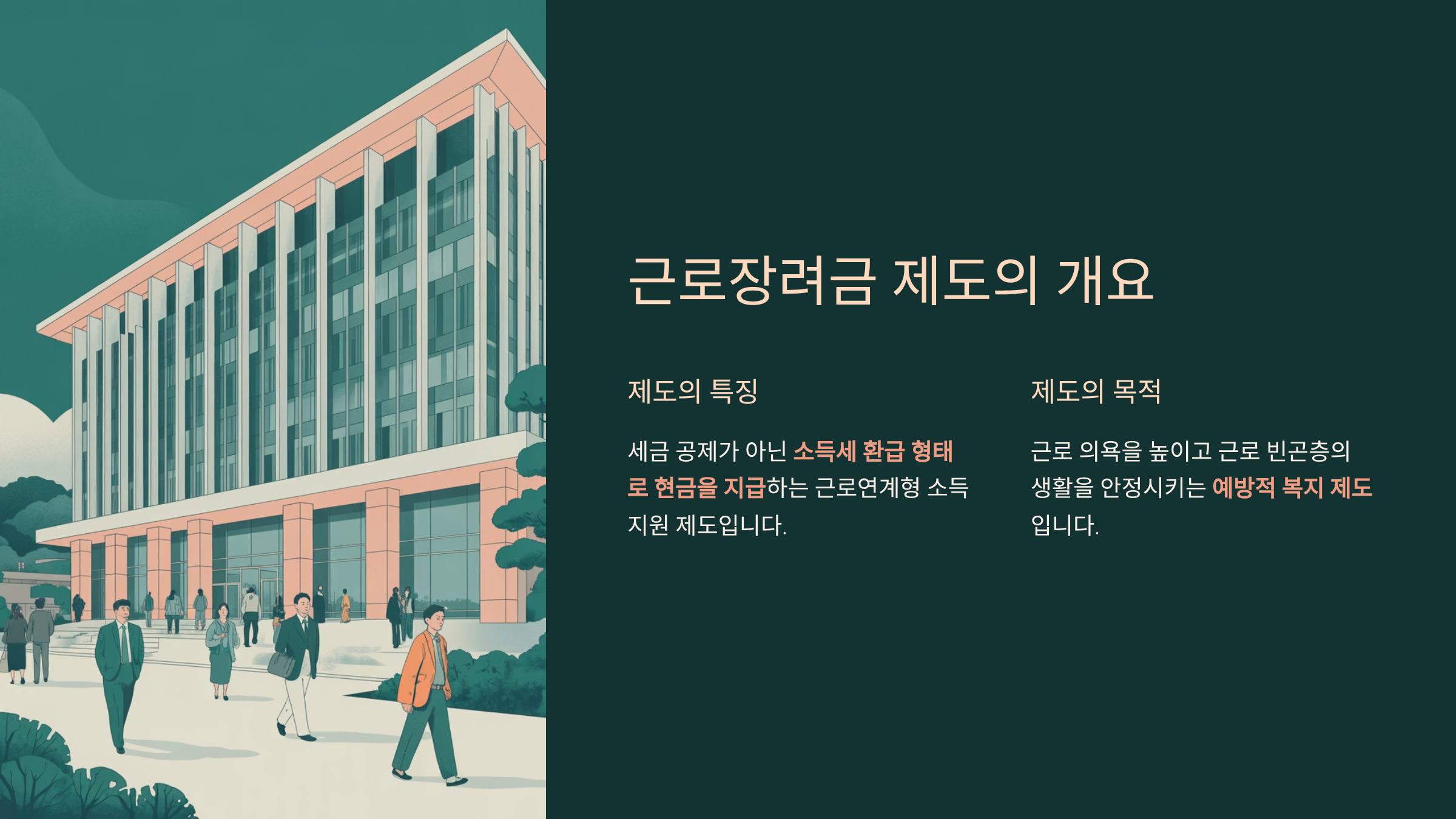 근로장려금은 정부가 일하는 사람에게 실질적인 보상을 제공하기 위해 마련한 근로연계형 소득지원 제도입니다.