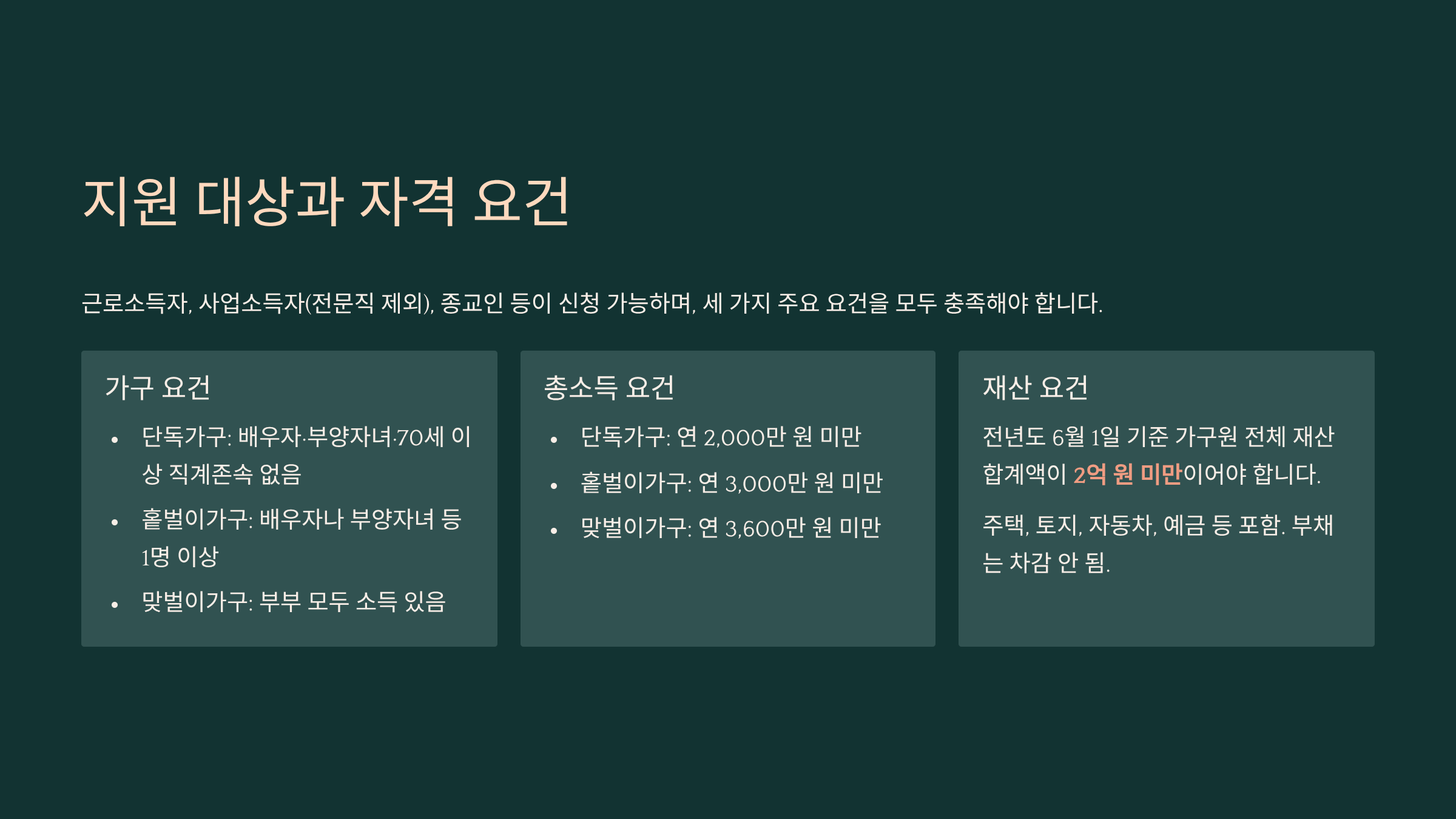 전년도 6월 1일 기준으로 가구원 전체의 재산 합계액이 2억 원 미만이어야 합니다.