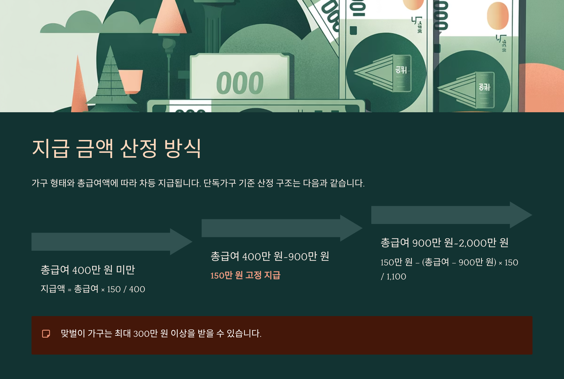 이렇게 가구 형태에 따라 기준 금액과 지급 한도가 다르게 적용됩니다.