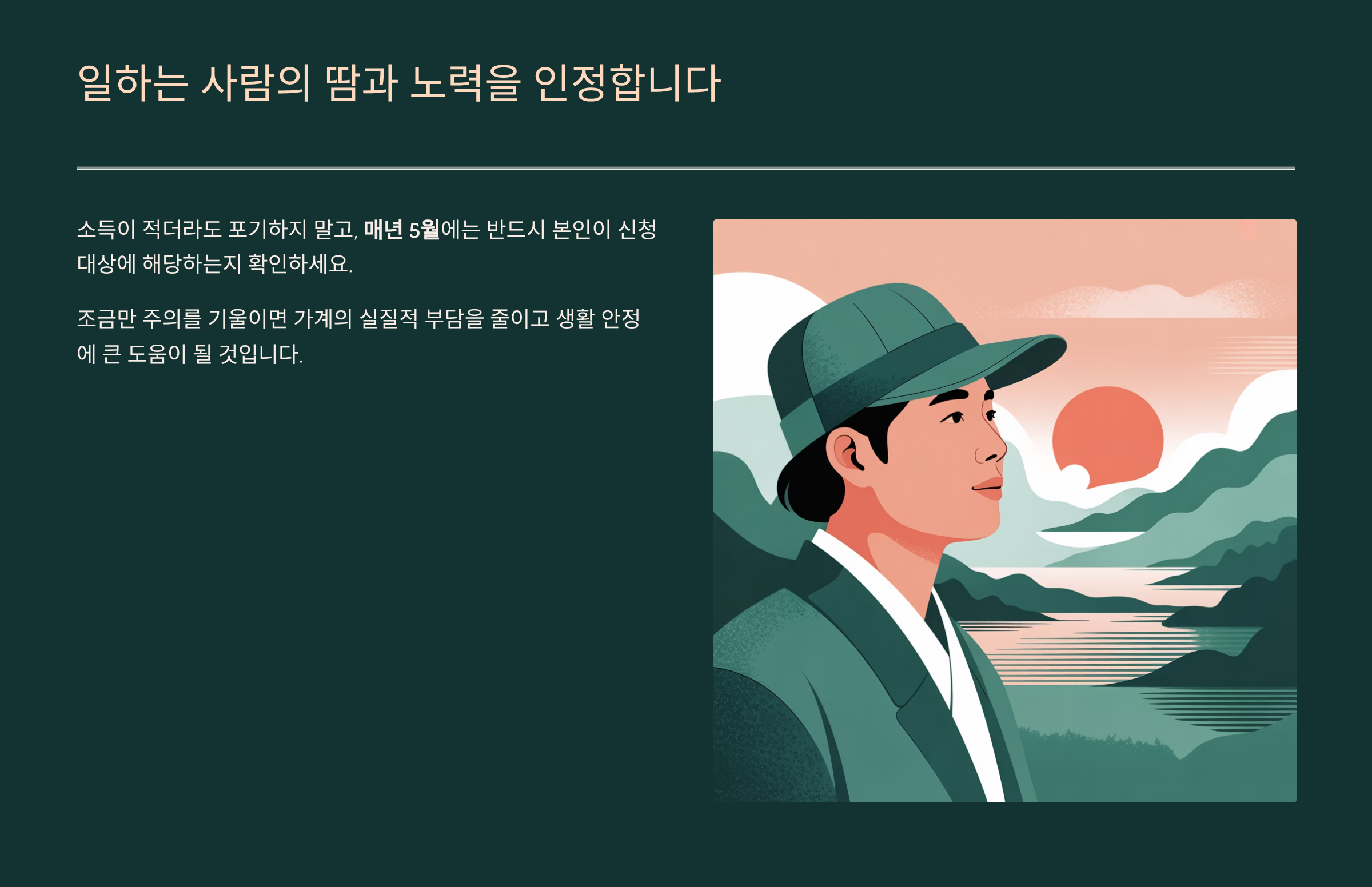소득이 적더라도 포기하지 말고, 매년 5월에는 반드시 본인이 신청 대상에 해당하는지 확인하시기 바랍니다.
