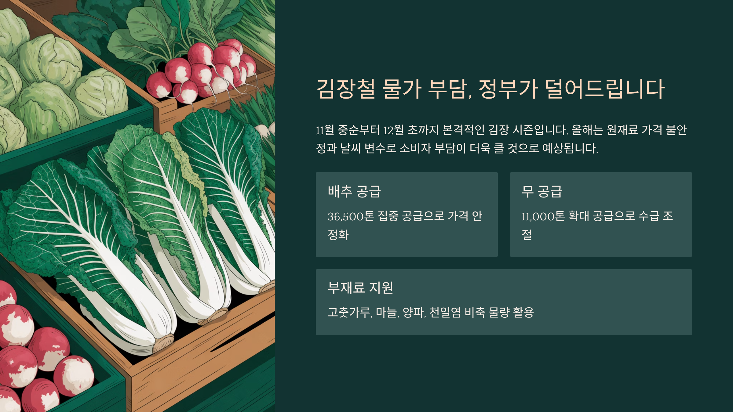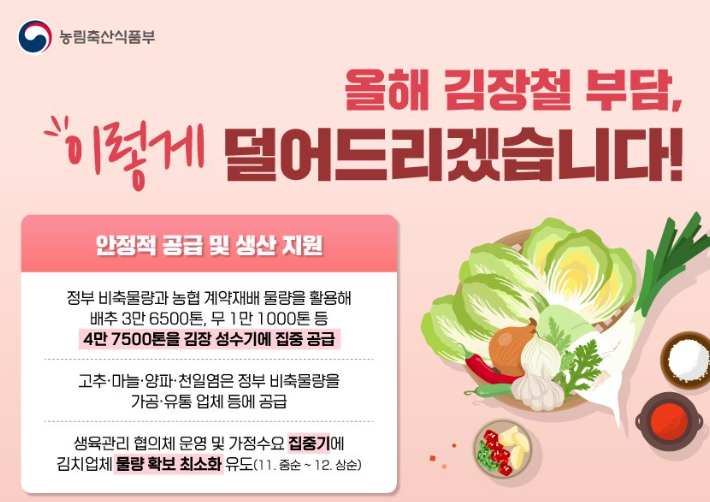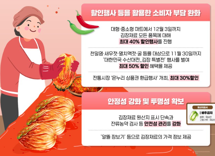 이에 정부는 김장철을 앞두고 국민들의 체감 물가 부담을 줄이기 위해 김장재료 공급 확대 및 할인 지원 정책을 본격적으로 시행한다고 밝혔습니다.