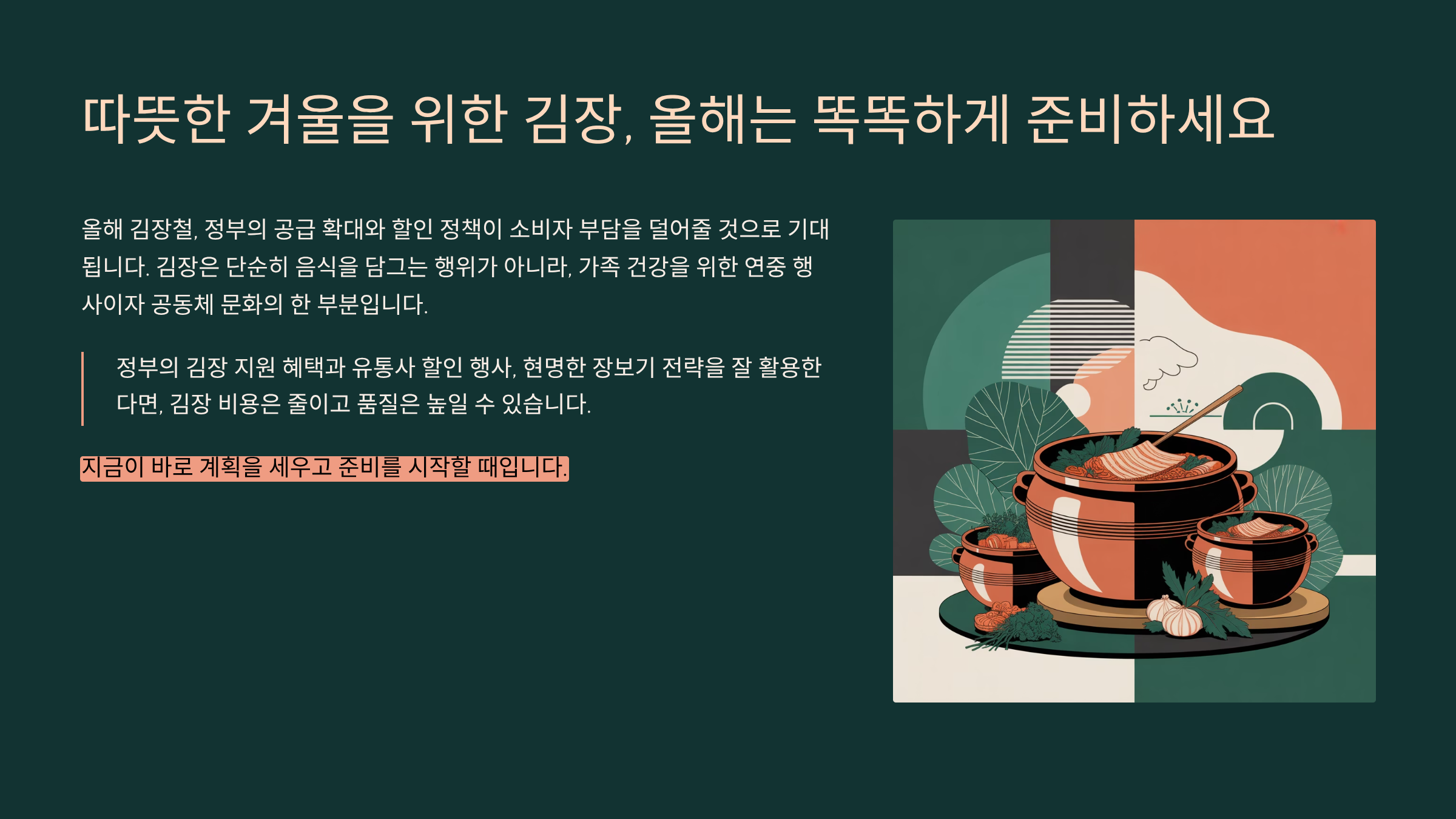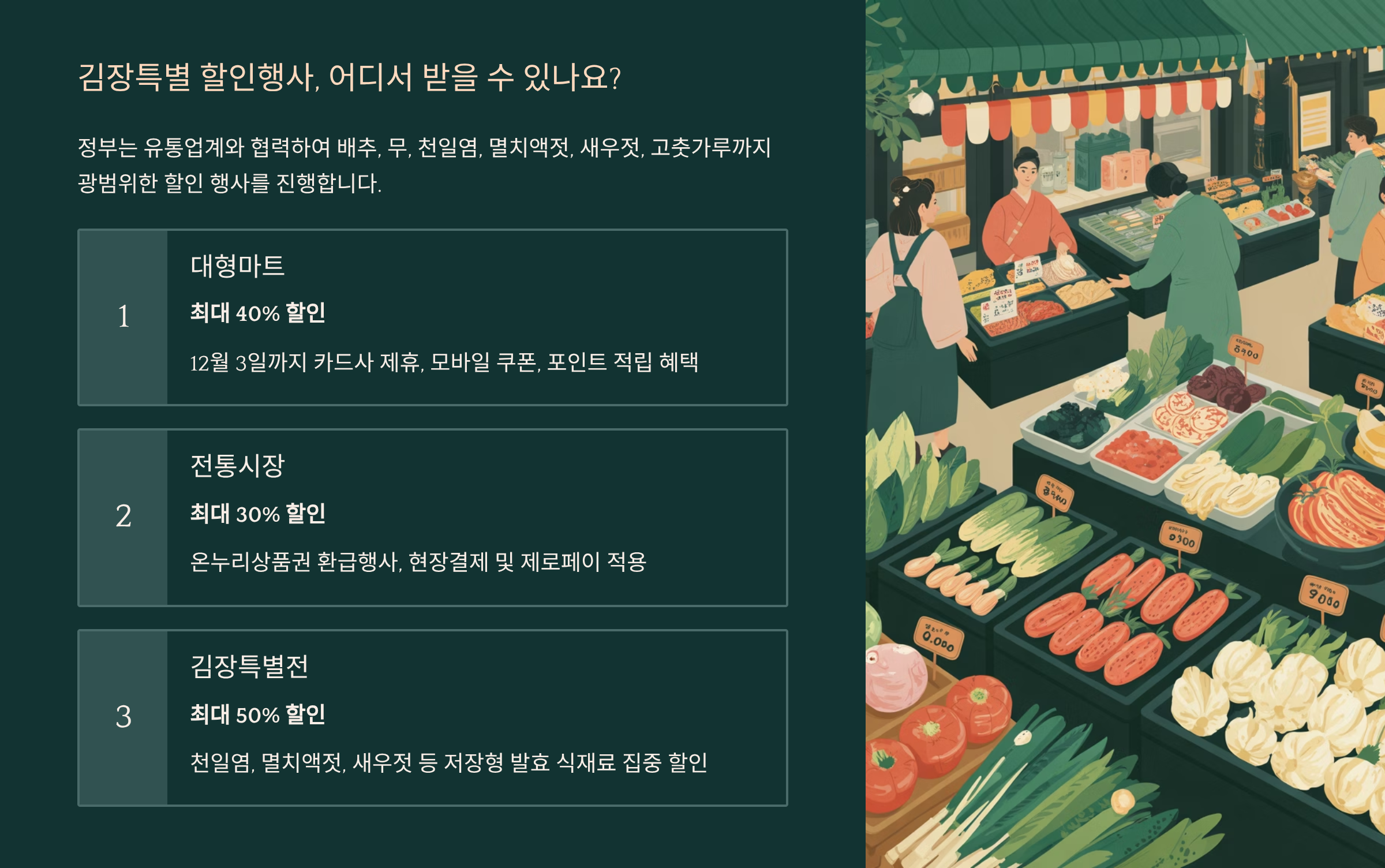정부의 김장 지원 혜택과 유통사 할인 행사, 현명한 장보기 전략을 잘 활용한다면, 김장 비용은 줄이고 품질은 높일 수 있습니다.
