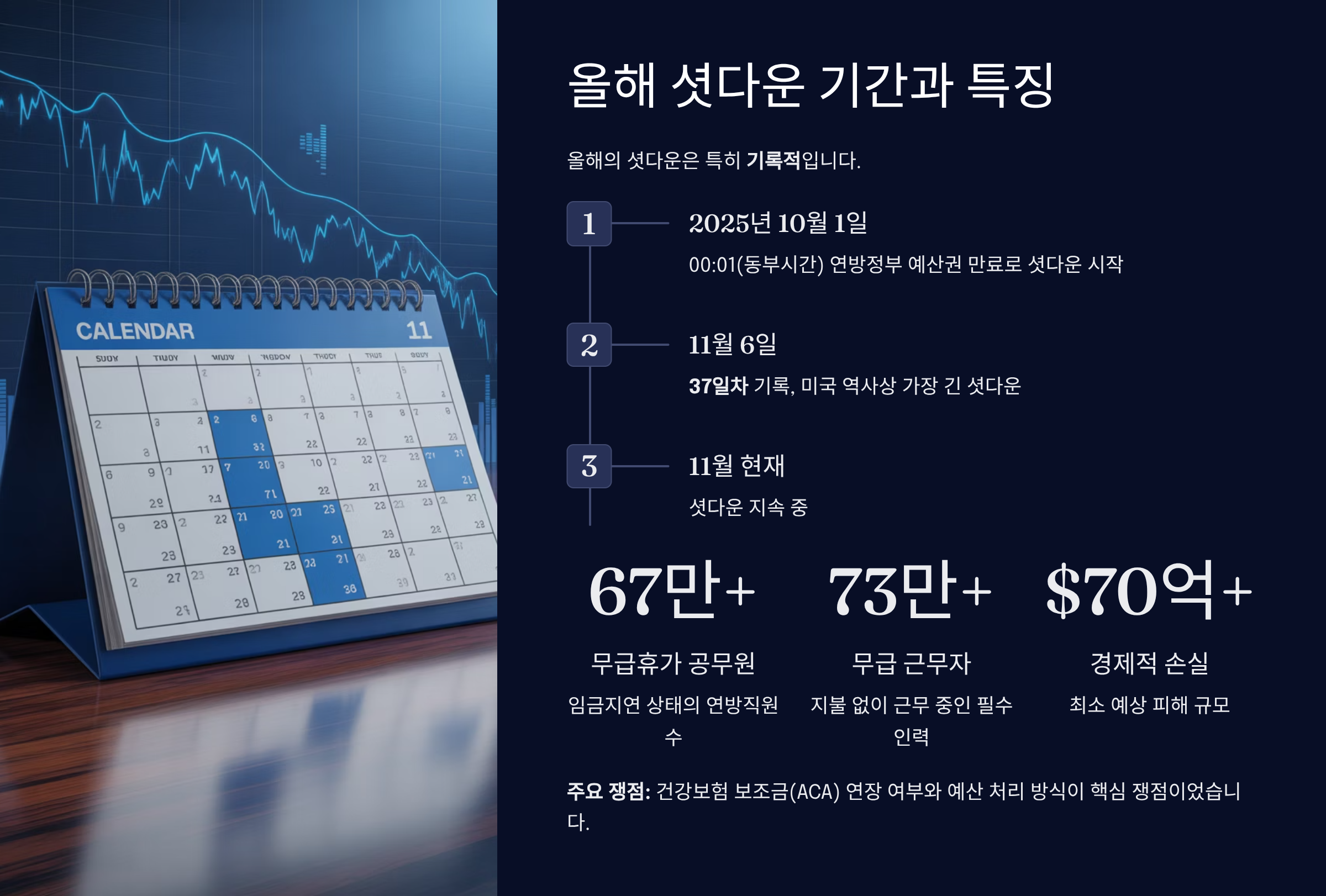 지속 상황: 이 셧다운은 2025년 11월 현재까지 지속 중이며, 11월 6일 기준으로 37일차를 기록하면서 미국 역사상 가장 긴 셧다운이 되었습니다.