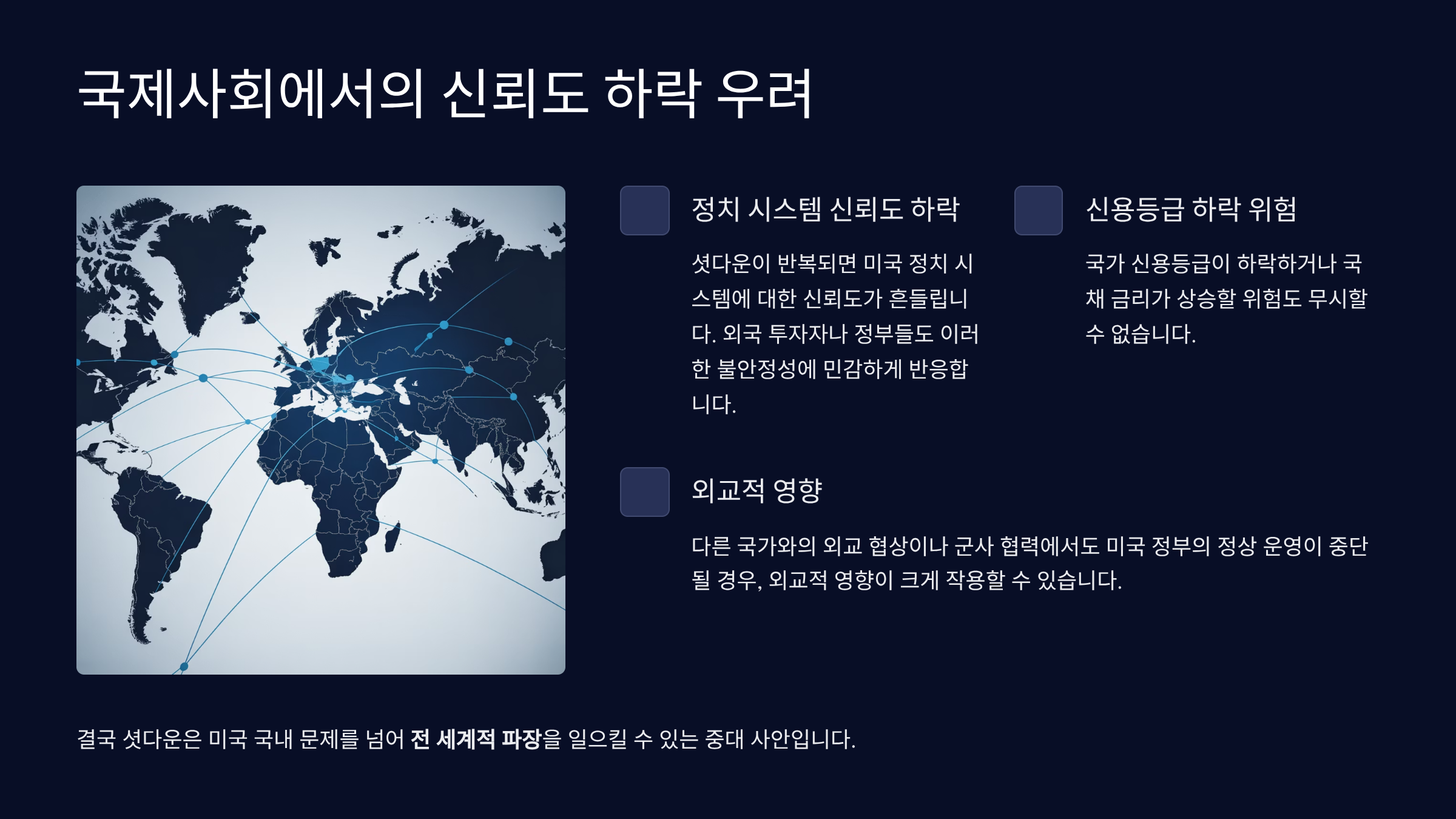 결국 셧다운은 미국 국내 문제를 넘어 전 세계적 파장을 일으킬 수 있는 중대 사안입니다.