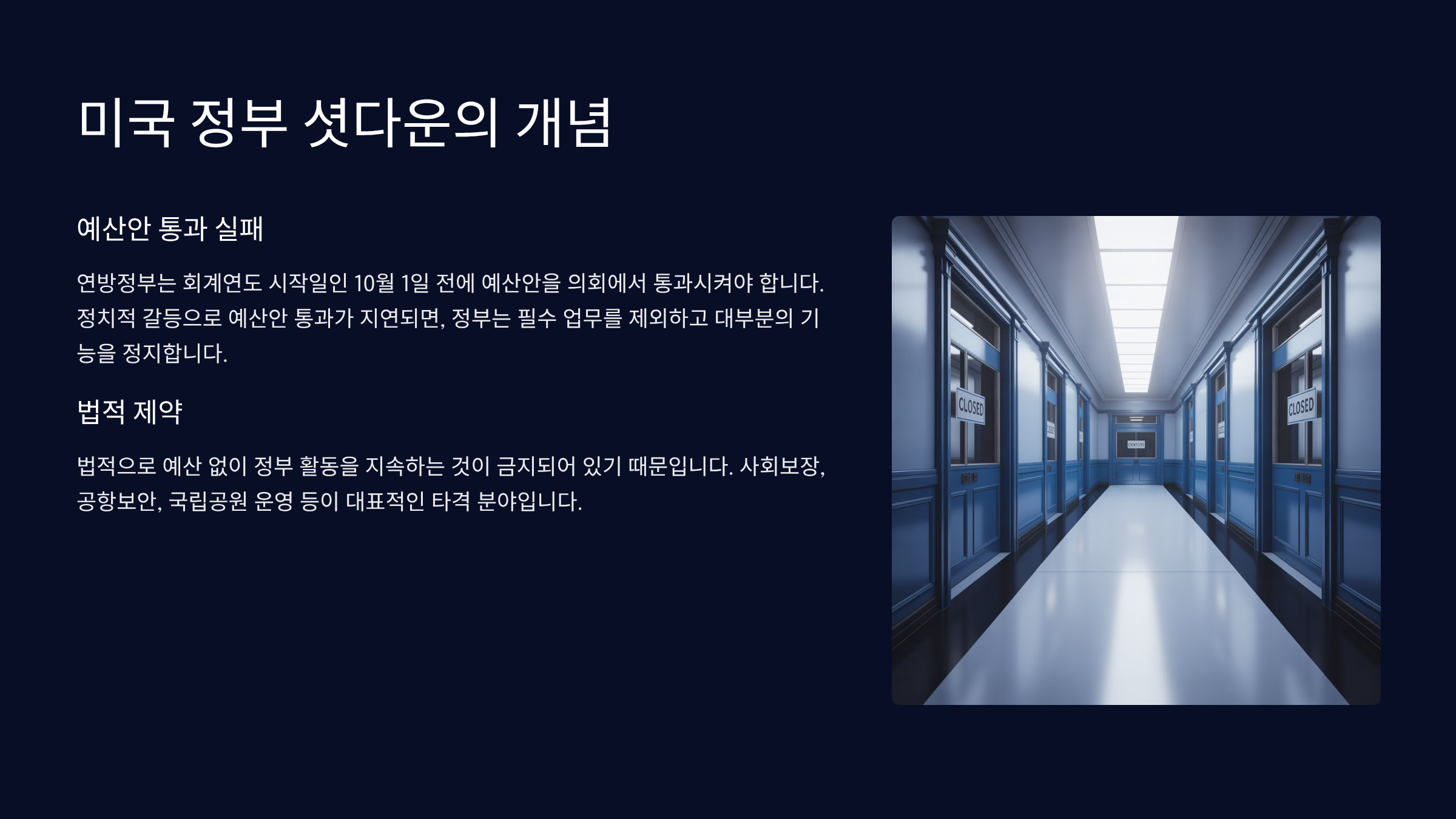 미국 연방정부는 회계연도 시작일인 10월 1일 전에 예산안을 의회에서 통과시켜야 합니다. 하지만 정치적 갈등으로 인해 예산안 통과가 지연되면, 정부는 필수 업무를 제외하고 대부분의 기능을 정지하게 됩니다.