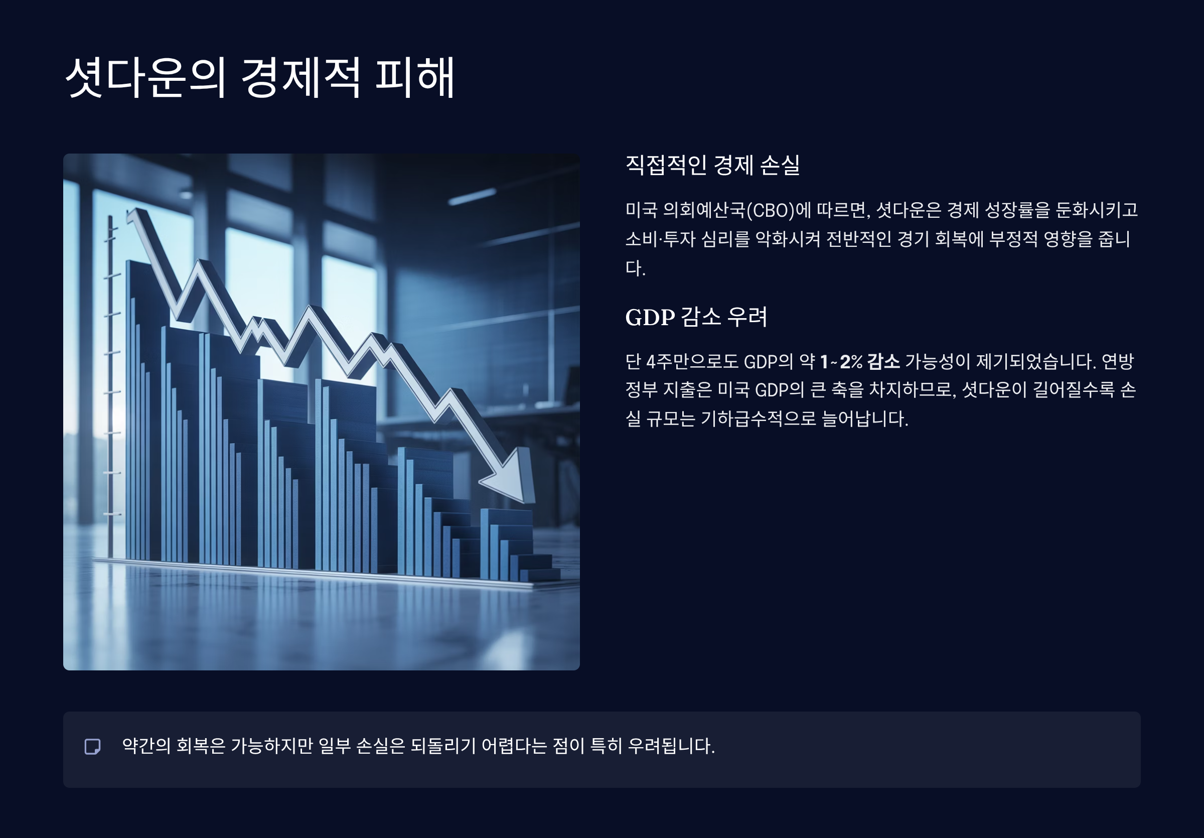 경제적 피해 전망: 이번 셧다운으로 인해 미국 경제에는 최소 70억 달러 이상의 손실이 우려되며, 단 4주만으로도 GDP의 약 1~2% 감소 가능성이 제기되었습니다.